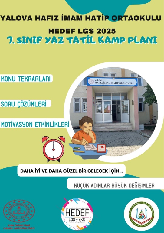 7. sınıf öğrencilerimizin yaz tatilini verimli geçirmeleri ve yeni döneme güçlü bir başlangıç yapmaları amacıyla Yaz Tatili Kampı planlanmıştır.