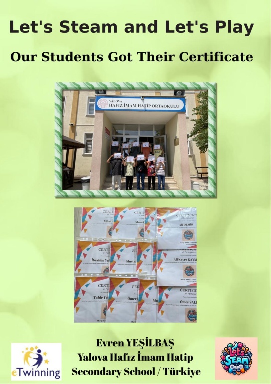 Okulumuzun 2024-2025 eğitim öğretim yılında yürüttüğü eTwinning projesinde yer alan öğrencilerimize sertifikaları takdim edildi. Avrupa’daki okullar arasında iş birliğini teşvik eden eTwinning platformu kapsamında öğrencilerimiz, farklı ülkelerden akranlarıyla birlikte çeşitli dijital projelerde görev alarak hem dil becerilerini geliştirdi hem de kültürlerarası iletişim konusunda deneyim Kazandı.
